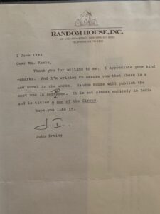 It all began with my love for bestselling author John Irving’s novels. My favorite, A Prayer for Owen Meany, had been published for some time, and I was growing eager for the next one. I decided to do something I’d never done before: I wrote Irving a fan letter expressing how much I enjoyed his work and inquired when his next book would be released. This took place in the summer of 1994. I didn’t expect a response. That summer, I had planned a trip to India, and just before I left, I received a reply. He mentioned that his next book would be released in September and that it was set in India. What a coincidence! But then . . .